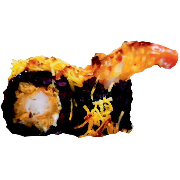 Tempura di gamberone, avocado, fili di patate, philadelphia, salsa teriyaki. Roll di riso (8pz).