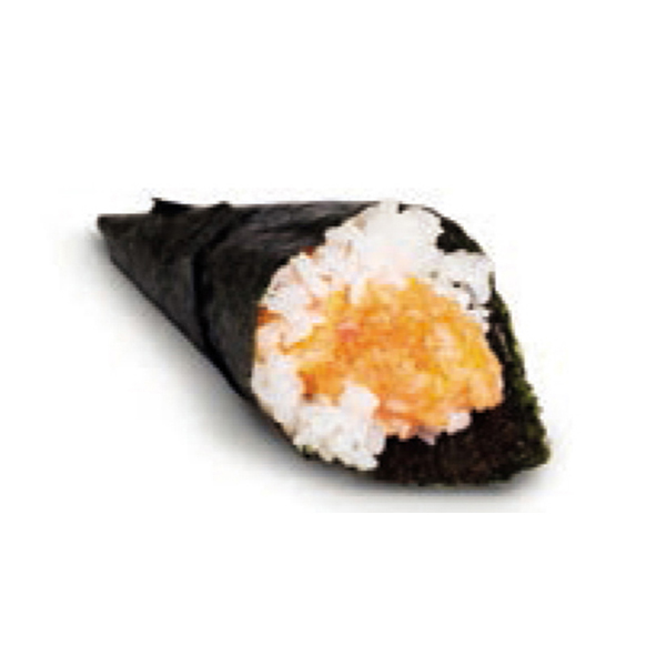 Tartare di salmone, avocado, salsa piccante. Cono di alga nori ripieno di riso (1pz).