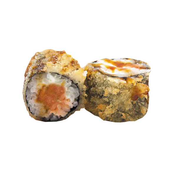 Salmone tutto in tempura con salsa teriyaki. Roll di riso piccoli (6pz).