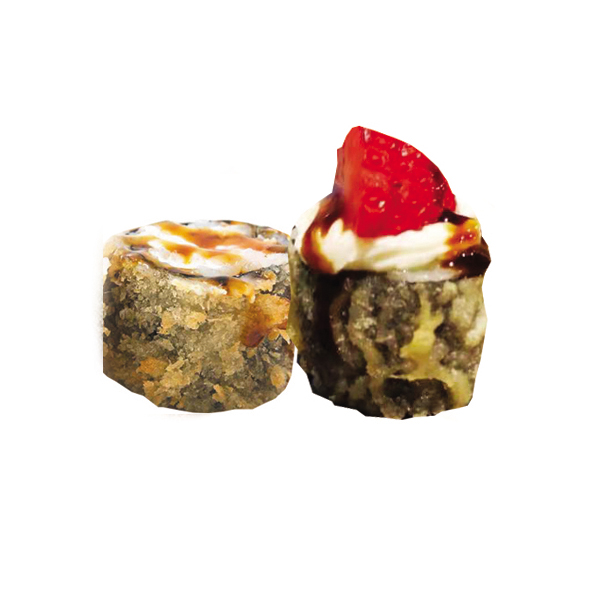 Salmone, philadelphia, tutto in tempura con frutta sopra. Roll di riso piccoli (6pz).
