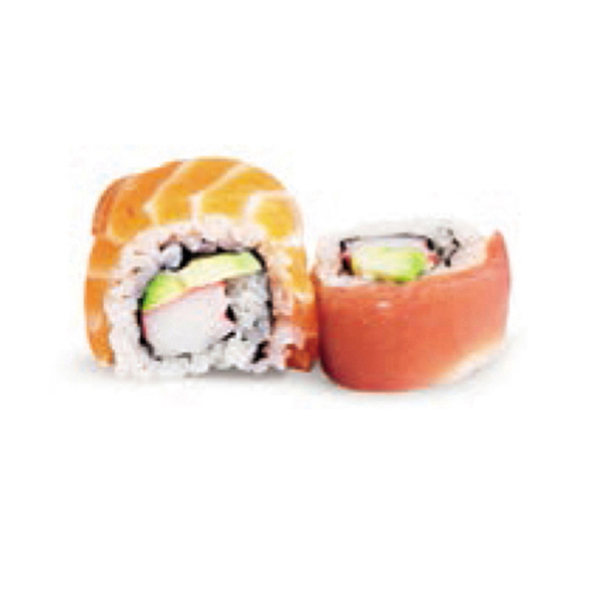 Surimi, avocado, mayo, esterno sashimi di gambero, salmone, tonno e branzino. Roll di riso (8pz).