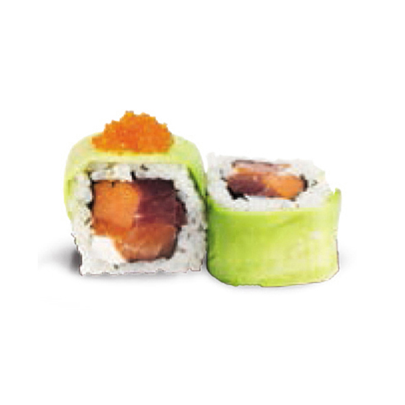 Philadelphia, tonno, salmone, esterno sashimi di avocado e uova di tobiko. Roll di riso (8pz).