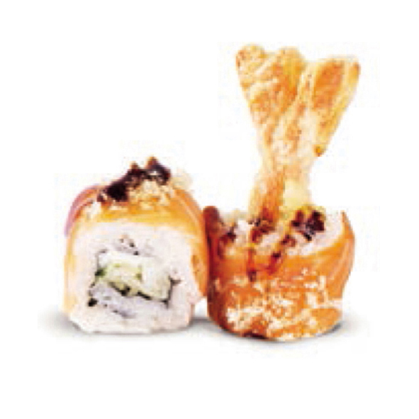 Gamberi in tempura, philadelphia, esterno salmone, fili di patate, teriyaki. Roll di riso (8pz).