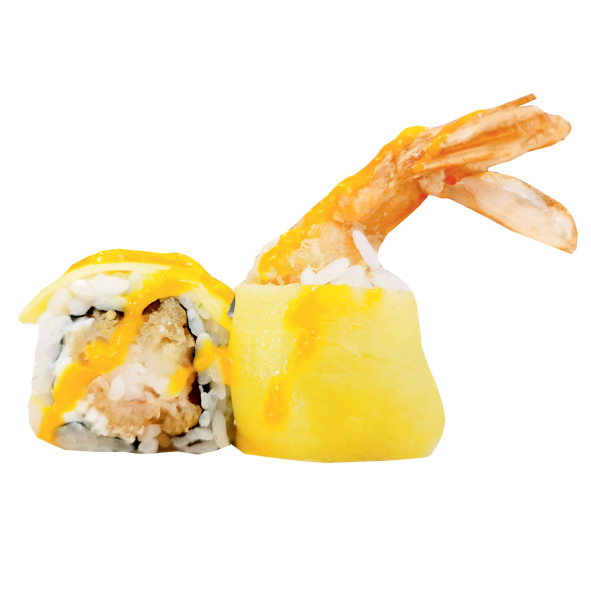 Gamberone in tempura, philadelphia, esterno mango, salsa mango. Roll di riso (8pz).